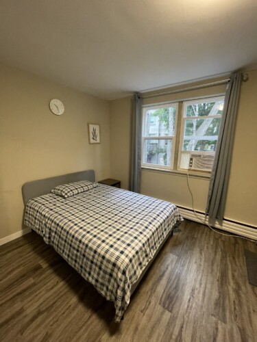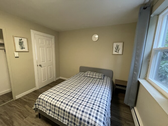 This private room includes one double sized bed, dresser and open closet. We