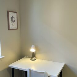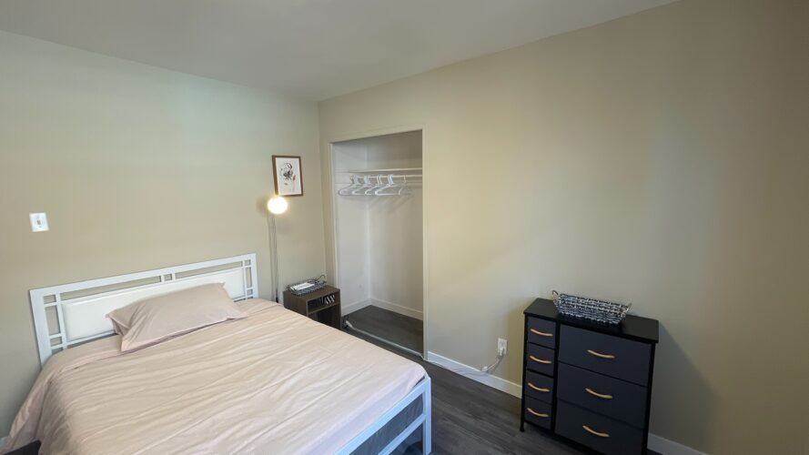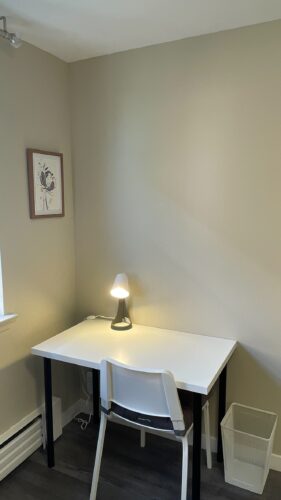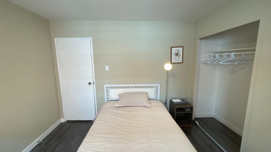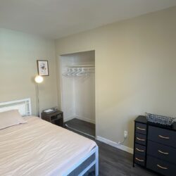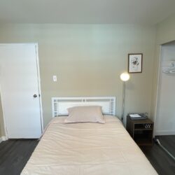 This private room includes one double sized bed, dresser and portable garment rack for your clothing. We also provide a work desk, comfy office chair and table lamp. All private rooms have key lock doors.