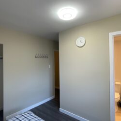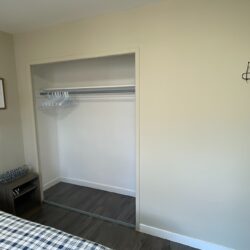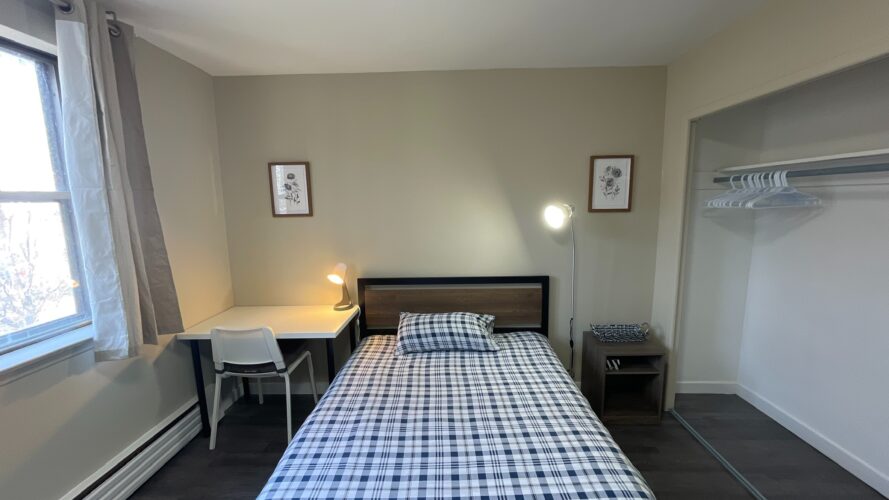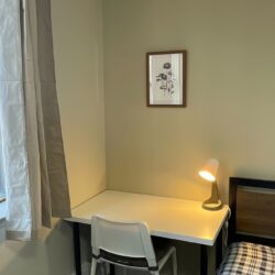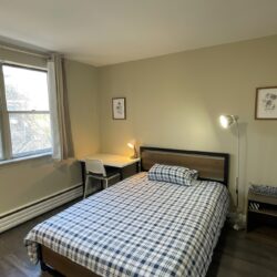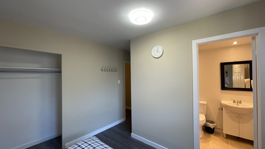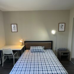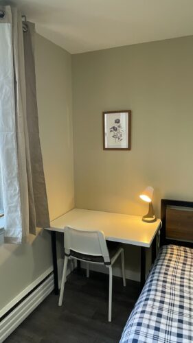 This private room includes one double sized bed, dresser and portable garment rack for your clothing. We also provide a work desk, comfy office chair and table lamp. All private rooms have key lock doors.