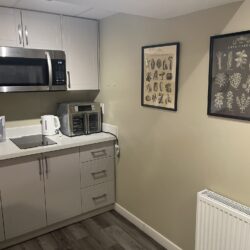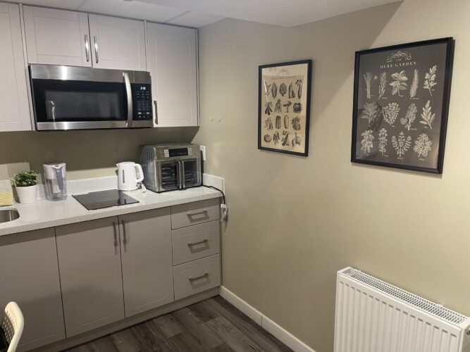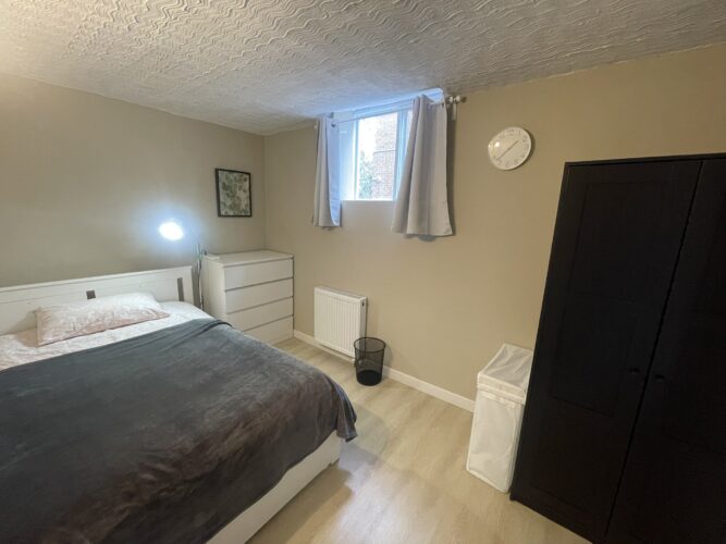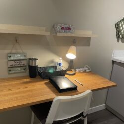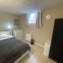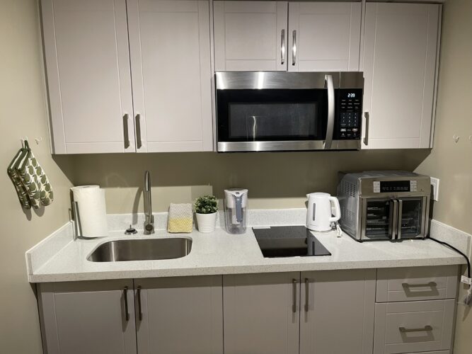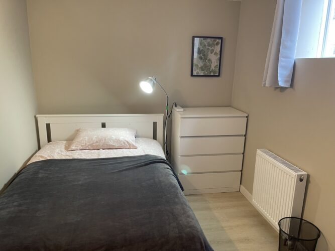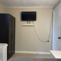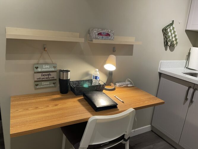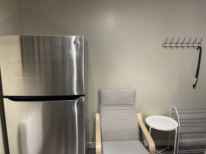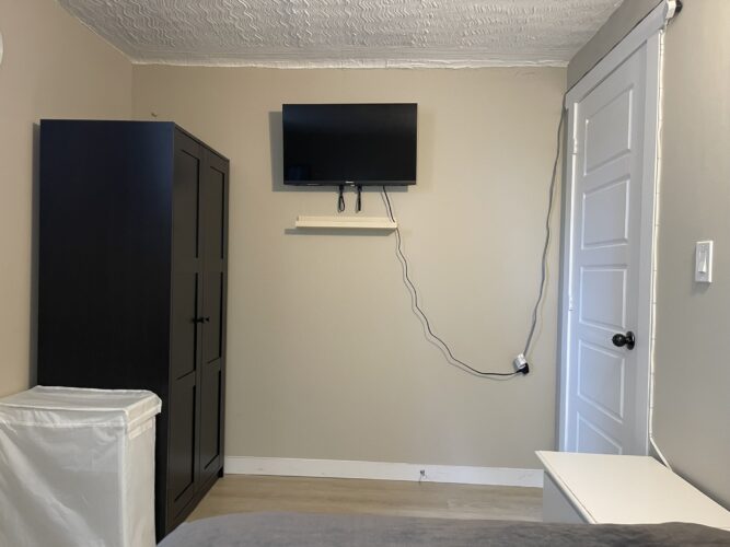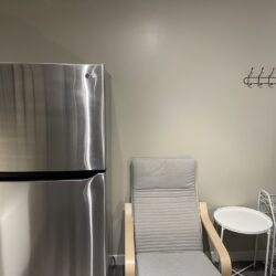 This private one bedroom unit includes one double sized bed, dresser, open closet and a work desk/chair. We also provide a lounge area with a comfy chair.