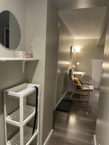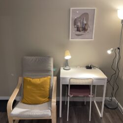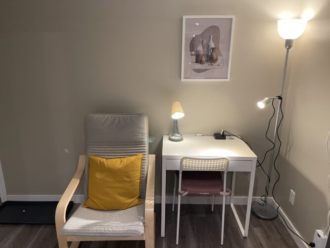 closet and a work desk/chair. We also provide a lounge area with a comfy chair.