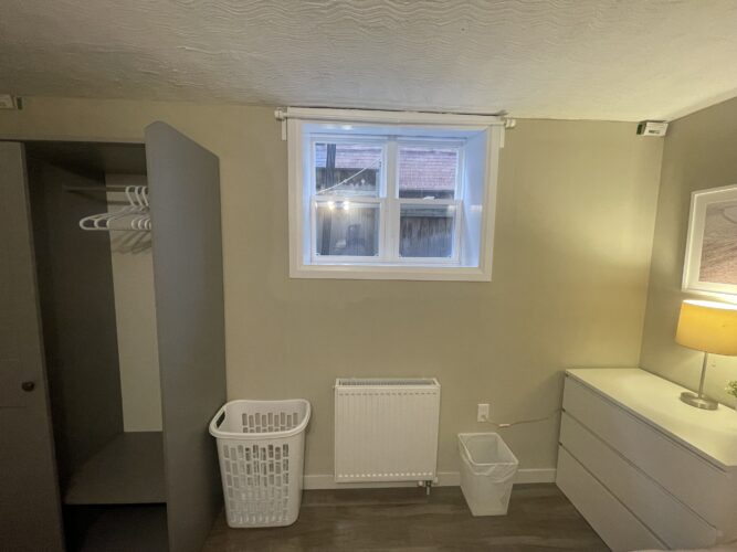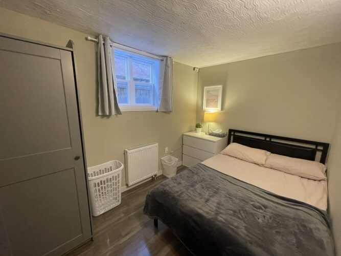 This private one bedroom unit includes one double sized bed, dresser, open